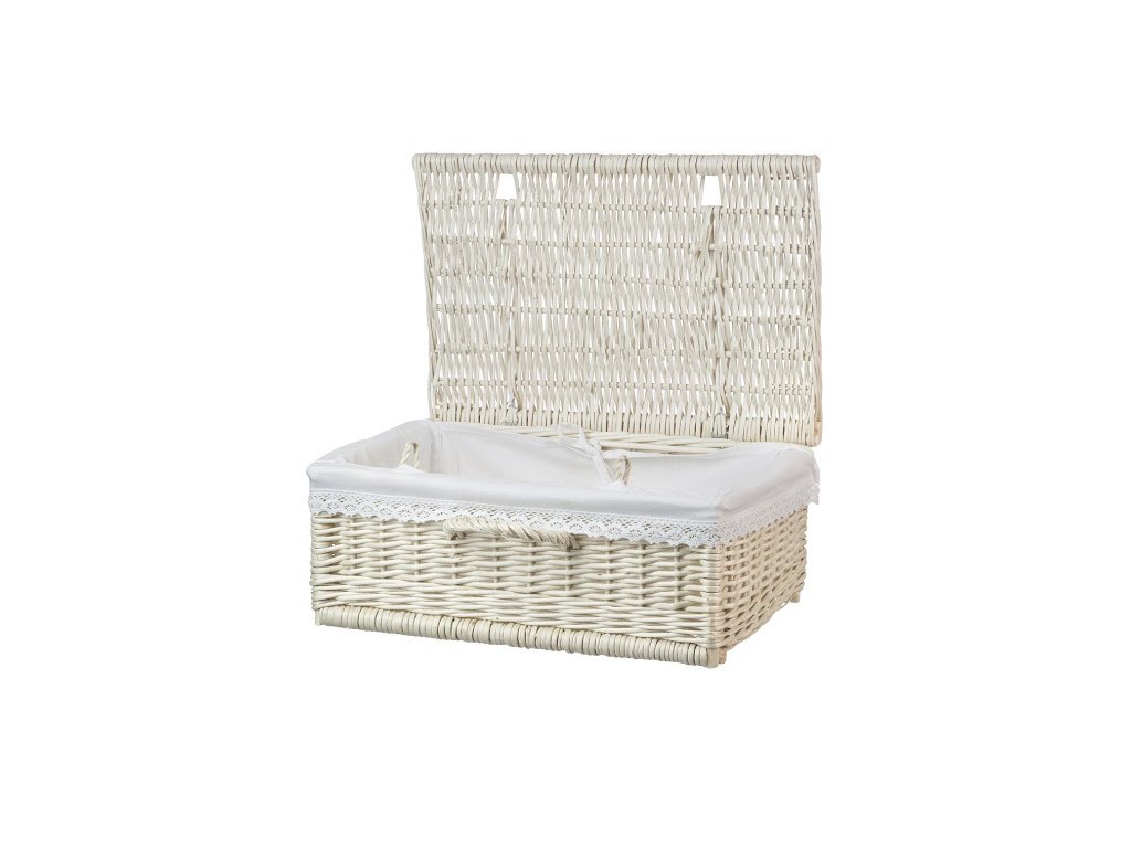 Ein leichter, quadratischer Korb aus geschälten Weidenruten, in dem man alles verstecken kann, was man nicht vor Augen haben will. Der Korb hat einen weißen Stoffeinsatz, der von Zeit zu Zeit herausgenommen und gewaschen werden kann.
