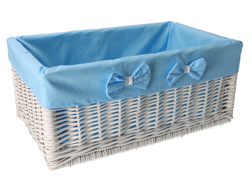 Ein leichter, quadratischer Korb aus geschälten Weidenruten, der mit himmelblauem Stoff und dekorativen Schleifen ausgekleidet ist und alles verbirgt, was nicht gesehen werden soll.