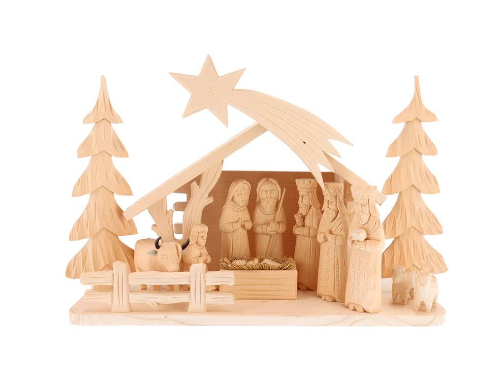 Die Holzkrippe aus Linde und Fichte zaubert eine wunderbare Weihnachtsstimmung in jedes Heim. Die liebevoll gefertigten, originellen Figuren machen diese Weihnachtskrippe einzigartig.
