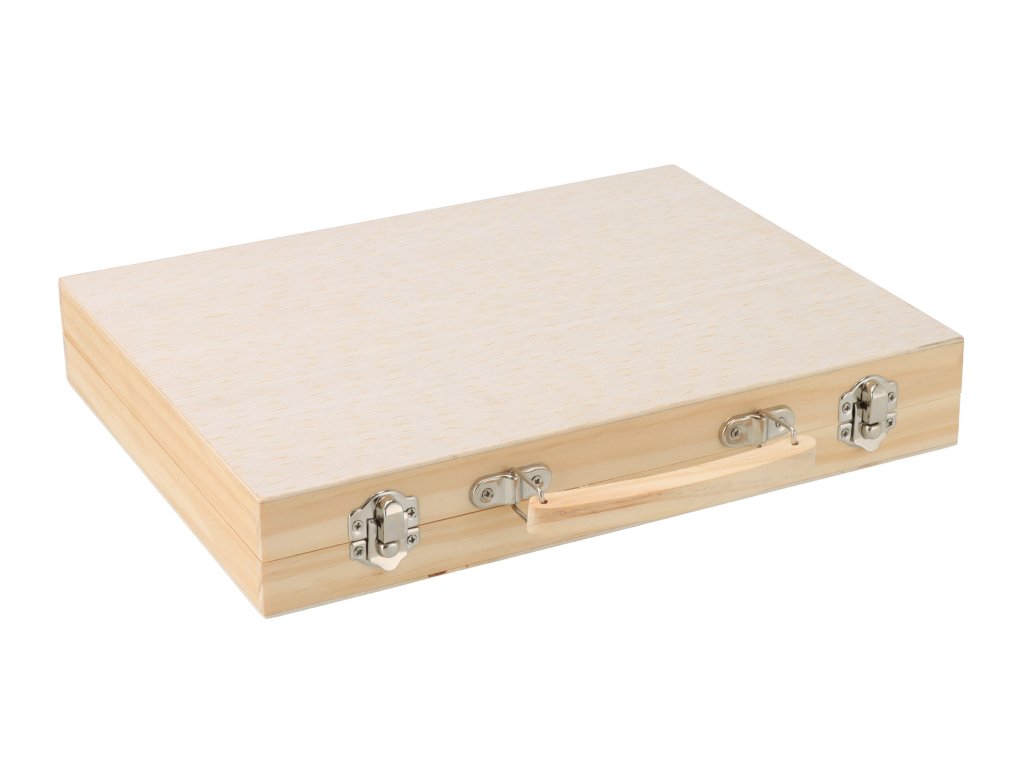 Ein Kunstkoffer aus Holz mit bis zu 67 Malutensilien, die jeder kleine Künstler zu Hause haben sollte. Das Zeichnen ist im Leben eines Kindes sehr wichtig. Es hilft ihm, seine motorischen Fähigkeiten, seine Vorstellungskraft und sein phantasievolles Denken zu entwickeln. Das Kind entdeckt neue Farben und die Welt um sich herum.