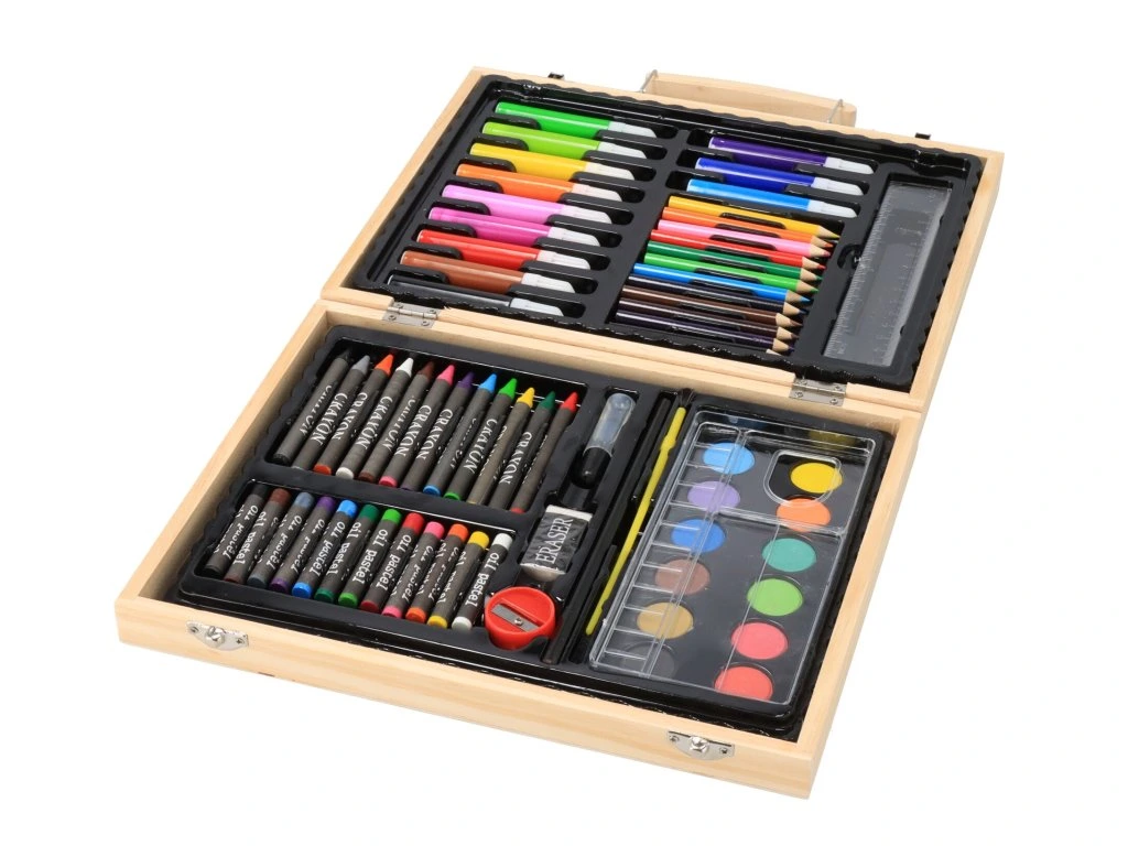 Buntstifte, Wachsmalstifte, Marker, Pinsel, Tusche, Radiergummi, Lineal, Kleber – all das findet sich in diesem tragbaren Kunstkoffer.