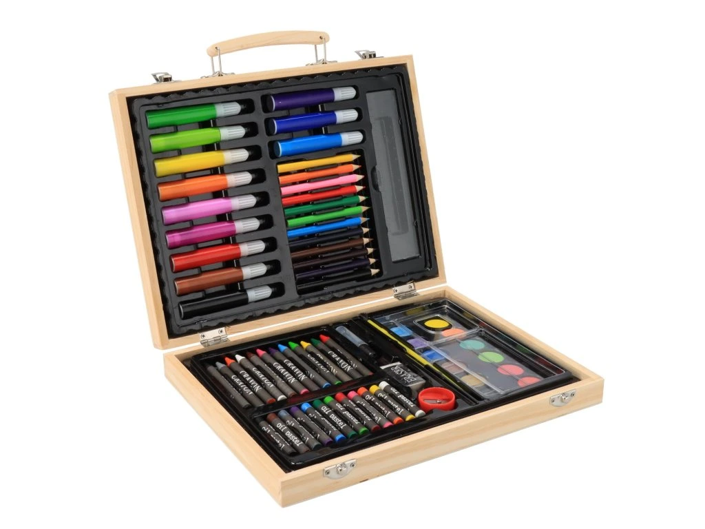 Ein Set voller Farbe! Geben Sie kleinen Künstlern einen hölzernen Kunstkoffer mit bis zu 67 Malwerkzeugen, die sie für ihre spektakulären Werke benötigen. Das Zeichnen hilft Kindern bei der Entwicklung ihrer motorischen Fähigkeiten, ihrer Vorstellungskraft und ihres phantasievollen Denkens.