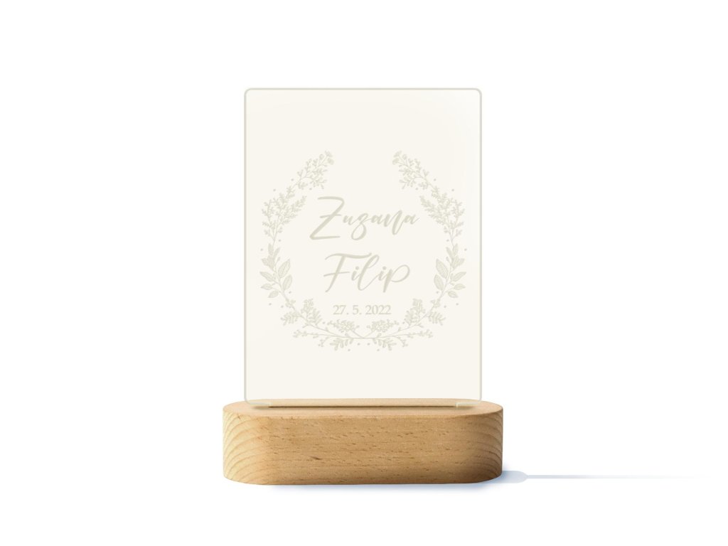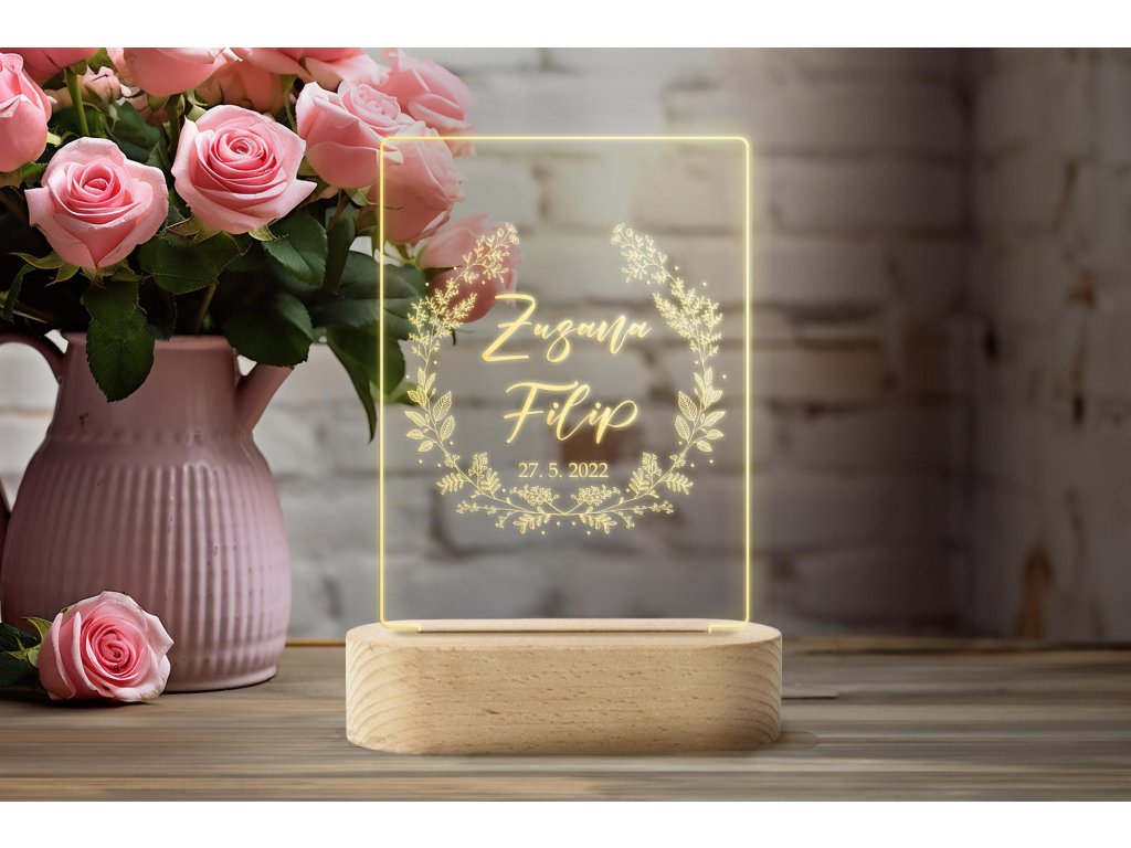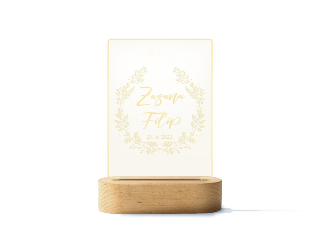 Ein originelles Hochzeitsgeschenk und eine schöne Erinnerung an Ihre gegenseitige Liebe – das ist die LED-Lampe mit Namen. Die Kombination aus Acrylglas und einem Holzständer wird jedes Interieur aufhellen.