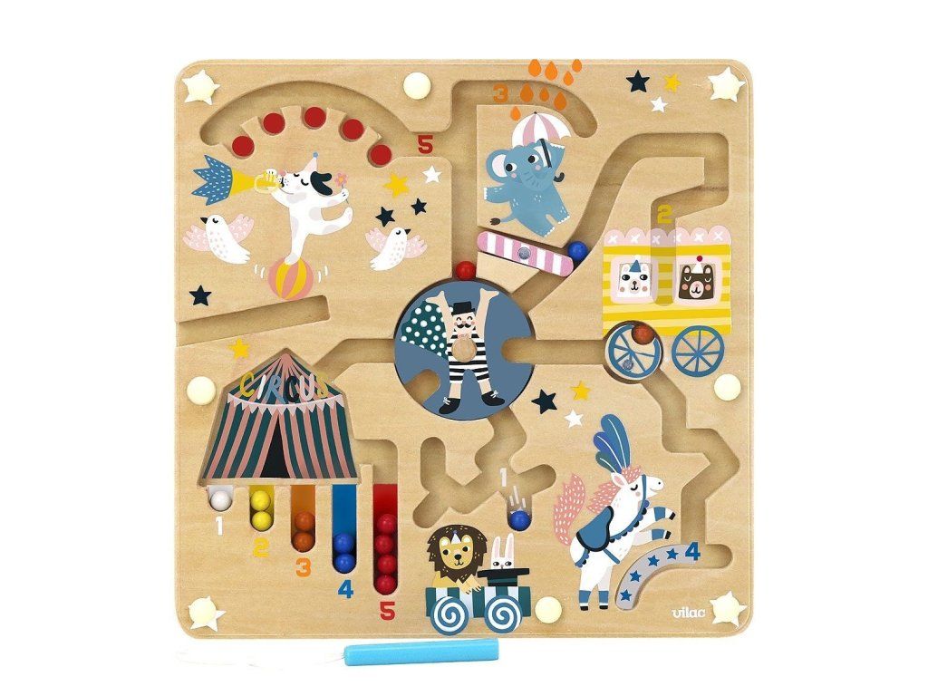 Das magnetische Labyrinth mit Zirkusmotiv ist ein pädagogisches Spielzeug für Kinder ab 2 Jahren. Es hilft ihnen, Geduld, Konzentration und Feinmotorik zu üben.