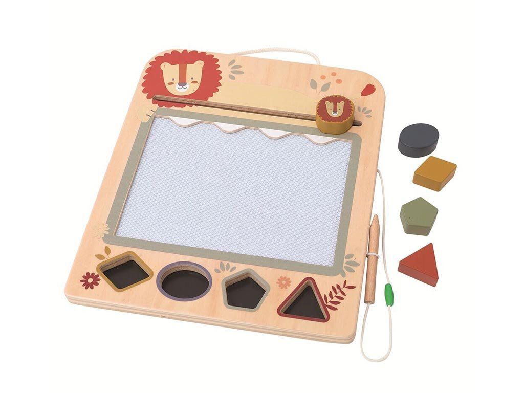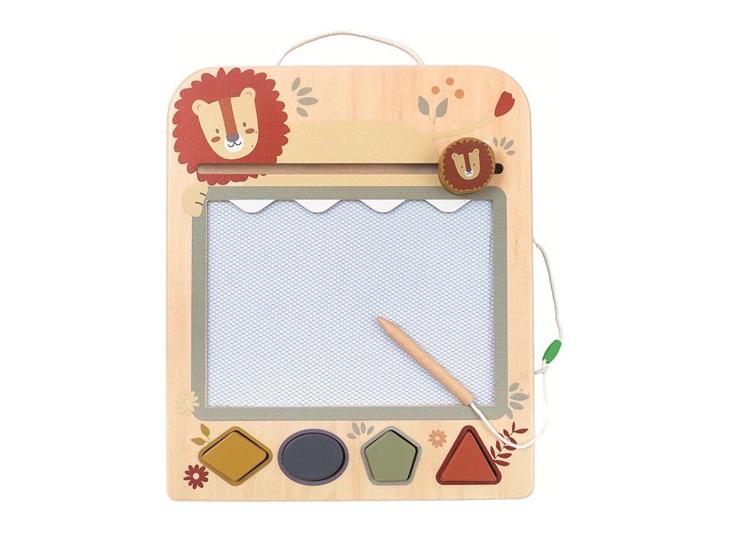 Das Zeichenbrett ist aus hochwertigem Holz gefertigt und überzeugt durch liebevolle Details sowie ein verspieltes Tiermotiv. Zusätzlich enthält es Magnetstempel in verschiedenen Formen, mit denen Kinder ihre Kunstwerke mit fröhlichen Mustern verzieren können.