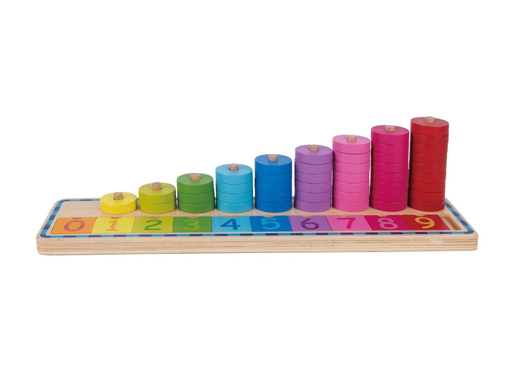 Das farbenfrohe Holzspiel ist ein ideales Hilfsmittel, um Kinder erstmals an Zahlen und das Zählen heranzuführen. Dank seiner klaren und übersichtlichen Gestaltung unterstützt es die natürliche Entwicklung mathematischer Fähigkeiten, des logischen Denkens und der Konzentration. Kinder lernen, Zahlen zu erkennen, die richtige Anzahl Kreise zuzuordnen und gleichzeitig Farben zu unterscheiden.