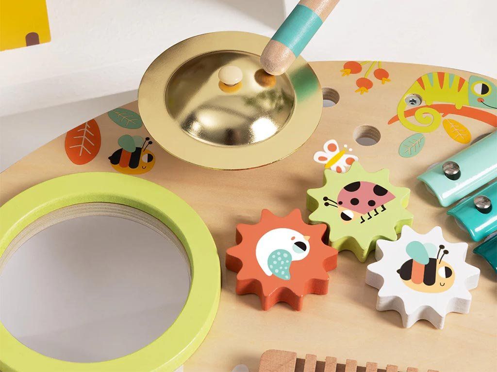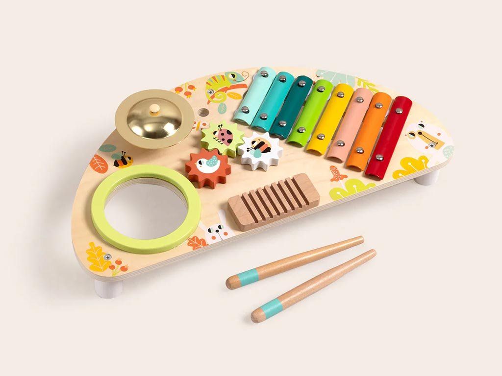 Das Musikzentrum umfasst verschiedene Instrumente wie Xylophon, Trommel und Becken, mit denen Kinder mit Klängen experimentieren und unterschiedliche Kombinationen entdecken können. Außerdem sind Schlägel enthalten, mit denen sie verschiedene Spielweisen ausprobieren können.