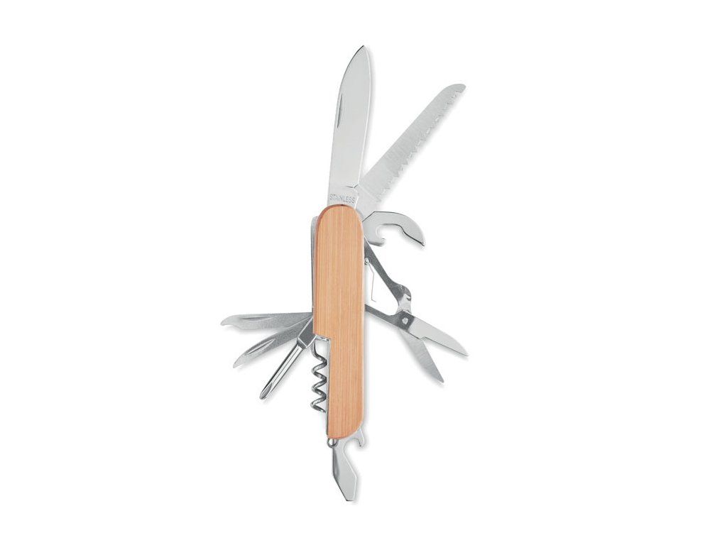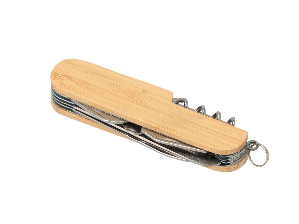 Klappbares Taschenmesser aus Bambus mit 9 Funktionen. Ein praktischer und nützlicher Helfer auf jeder Reise. Hergestellt aus hochwertigem Edelstahl.