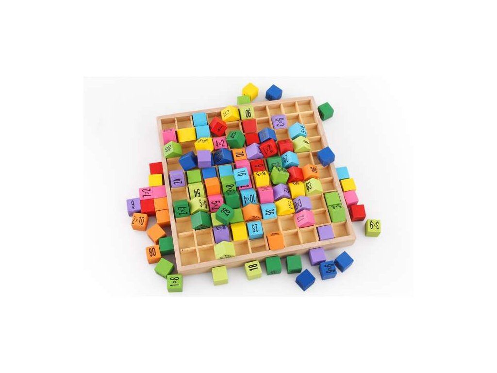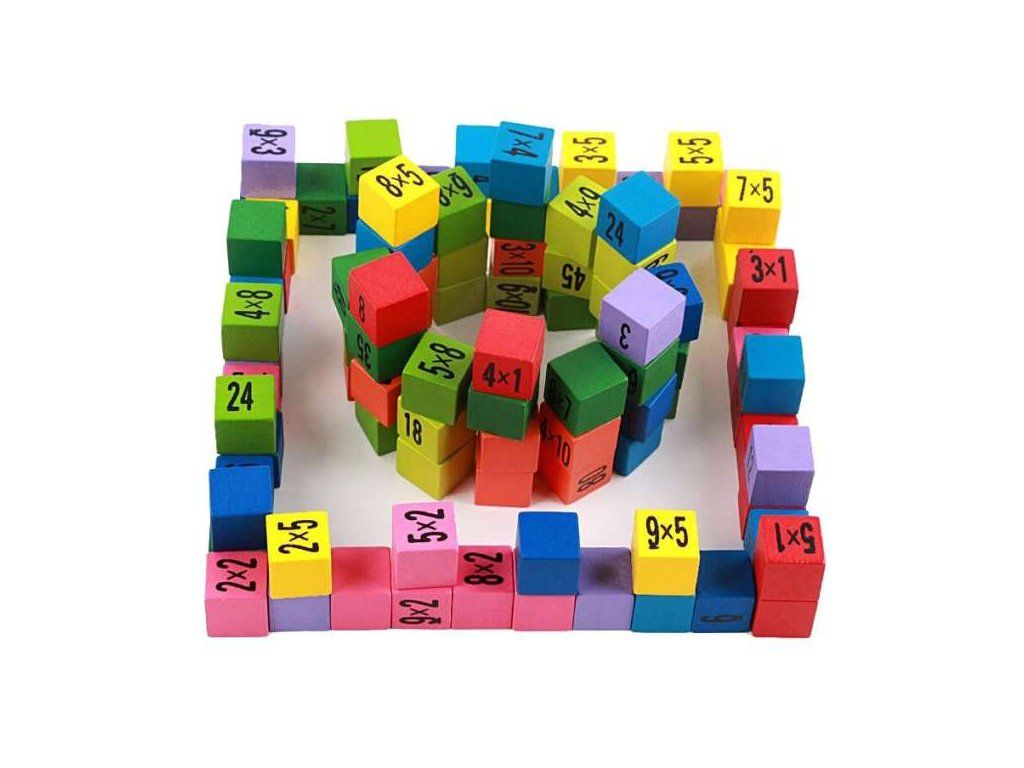 Das Lernset enthält 100 verschiedenfarbige Würfel. Auf einer Seite des Würfels steht eine Multiplikationsaufgabe, auf der anderen Seite ist das richtige Ergebnis versteckt.