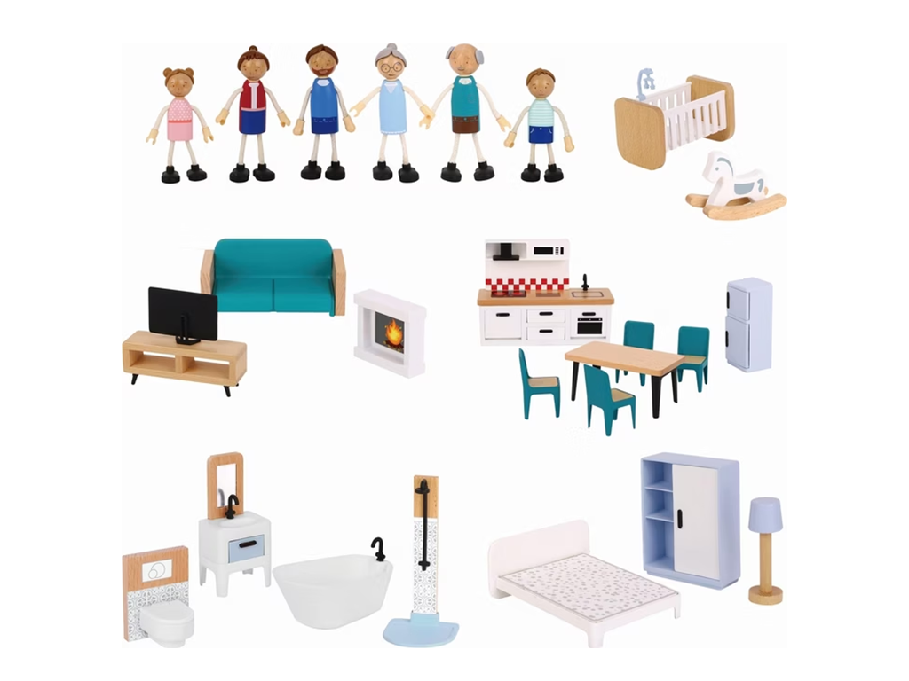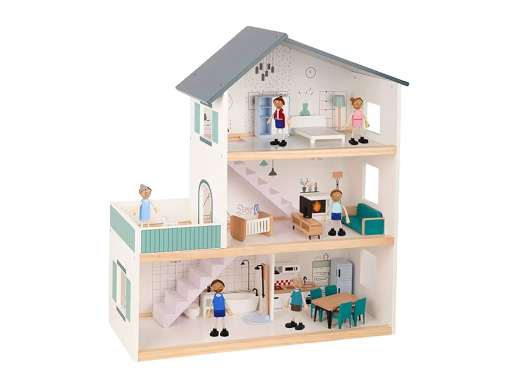 Das Haus verfügt über verschiedene Räume, die einem echten Zuhause nachempfunden sind – darunter ein Wohnzimmer, eine Küche, ein Badezimmer und ein Schlafzimmer. Zusätzlich sind Spielfiguren und Möbel enthalten, mit denen Kinder sofort eigene Geschichten und Alltagssituationen gestalten können. Das Spiel fördert Fantasie und Kreativität und unterstützt die Entwicklung sozialer Kompetenzen durch gemeinsames Spielen.