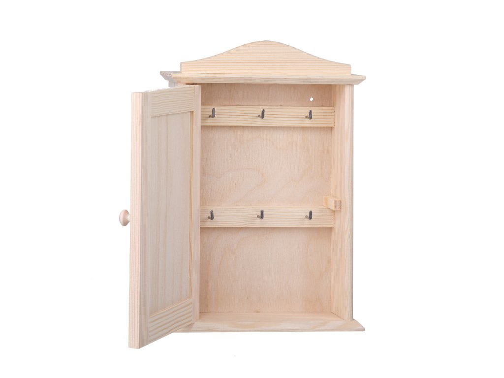 Der Schrank ist aus Kiefernholz gefertigt und im Inneren befinden sich Haken zum Aufhängen von Schlüsseln. An der Unterseite des Schranks befinden sich Holzösen, die Sie ebenfalls schätzen werden.