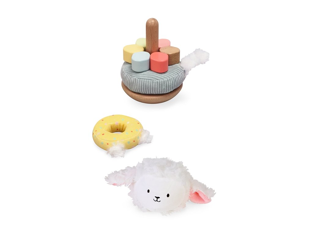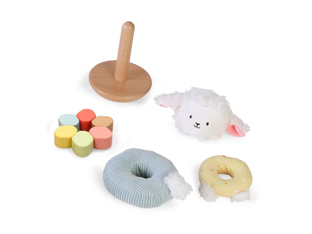 - Die Kombination aus Holz, Stoff und Plüsch unterstützt die sensorische Entwicklung