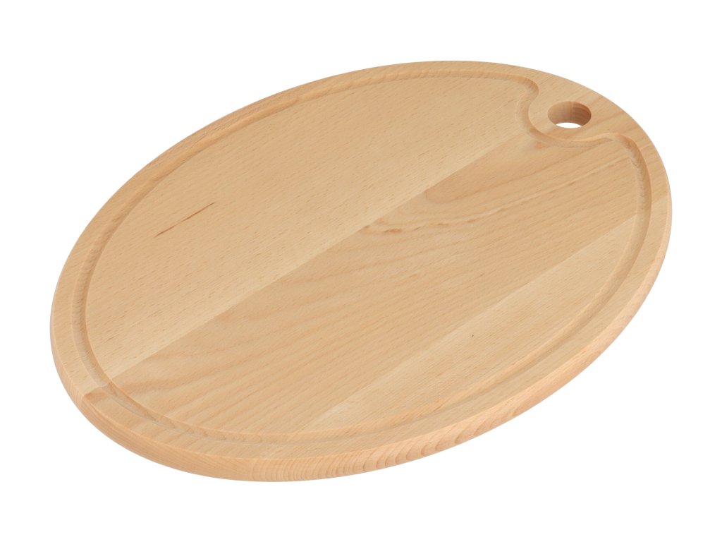 Ovales Schneidebrett aus Buchenholz mit einem praktischen Loch zum Aufhängen. Die Ablaufrinne ist praktisch beim Schneiden von Fleisch oder saftigem Obst.
