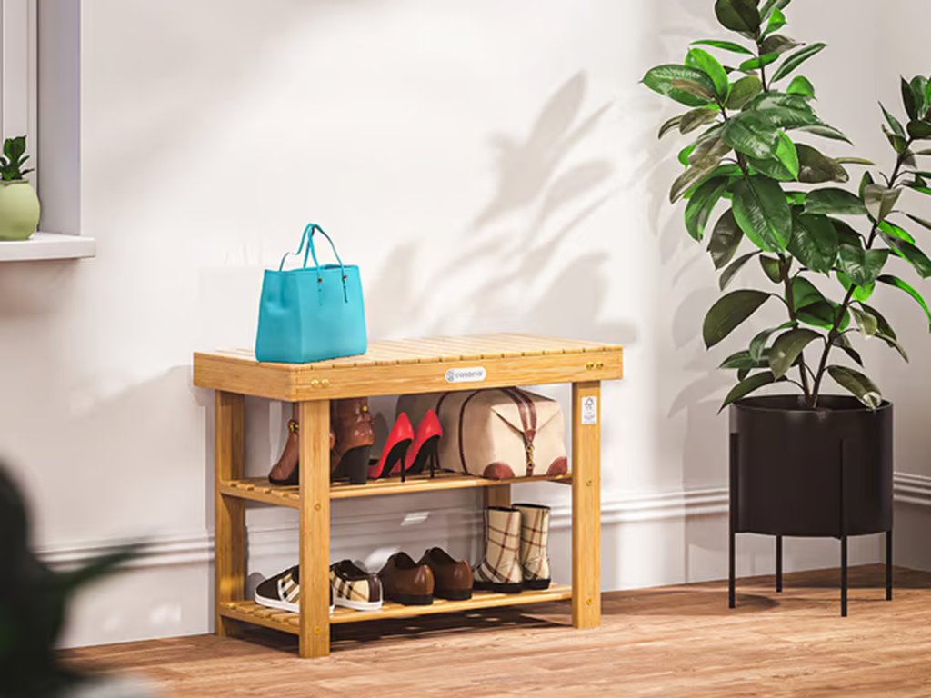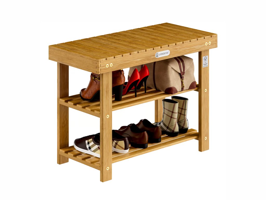 Das stilvolle Schuhregal aus massivem Akazienholz dient gleichzeitig als praktische Sitzbank, sodass Sie Ihre Schuhe bequem an- und ausziehen können. Die festen Ablagen bieten viel Platz für die ordentliche Aufbewahrung von Schuhen, und die Bank selbst kann zusätzlich als Ablagefläche genutzt werden.