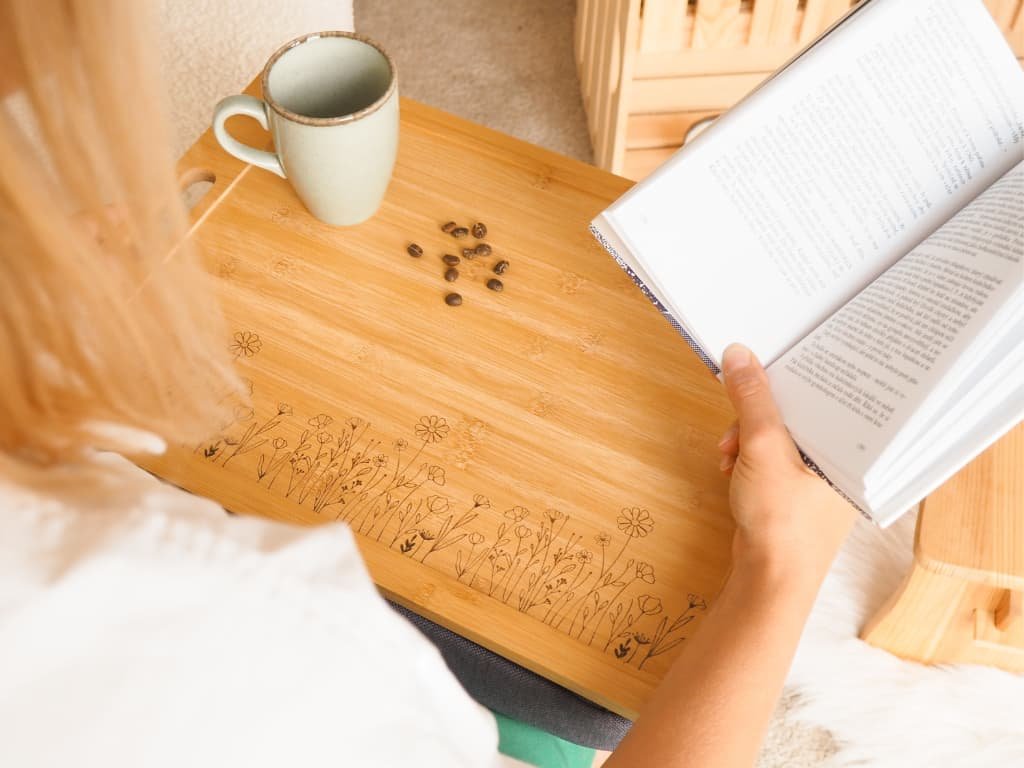 Dieses einzigartige Tablett bietet unzählige Verwendungsmöglichkeiten. Die flache Oberfläche ist ideal als Schreib- oder Laptopunterlage. Und das alles bequem zu Hause auf dem Sofa oder draußen im Garten.