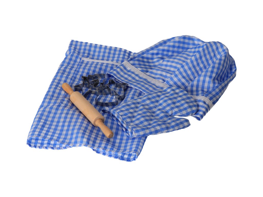 Das Set für kleine Chefköche besteht aus einer hübschen blauen Schürze, einem Ofenhandschuh, einer Kochmütze und einer Grundausstattung an Kochutensilien.
