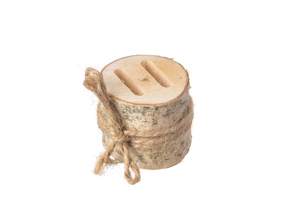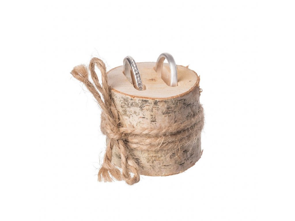 Holzunterlage für Eheringe in Form eines Birkenstammes.