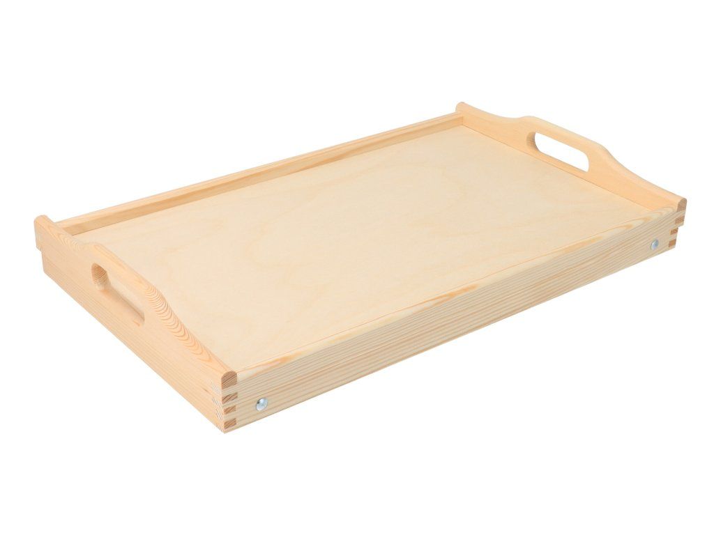Das Tablett ist 50 x 30 cm groß und besteht aus unlackiertem Kiefernholz.