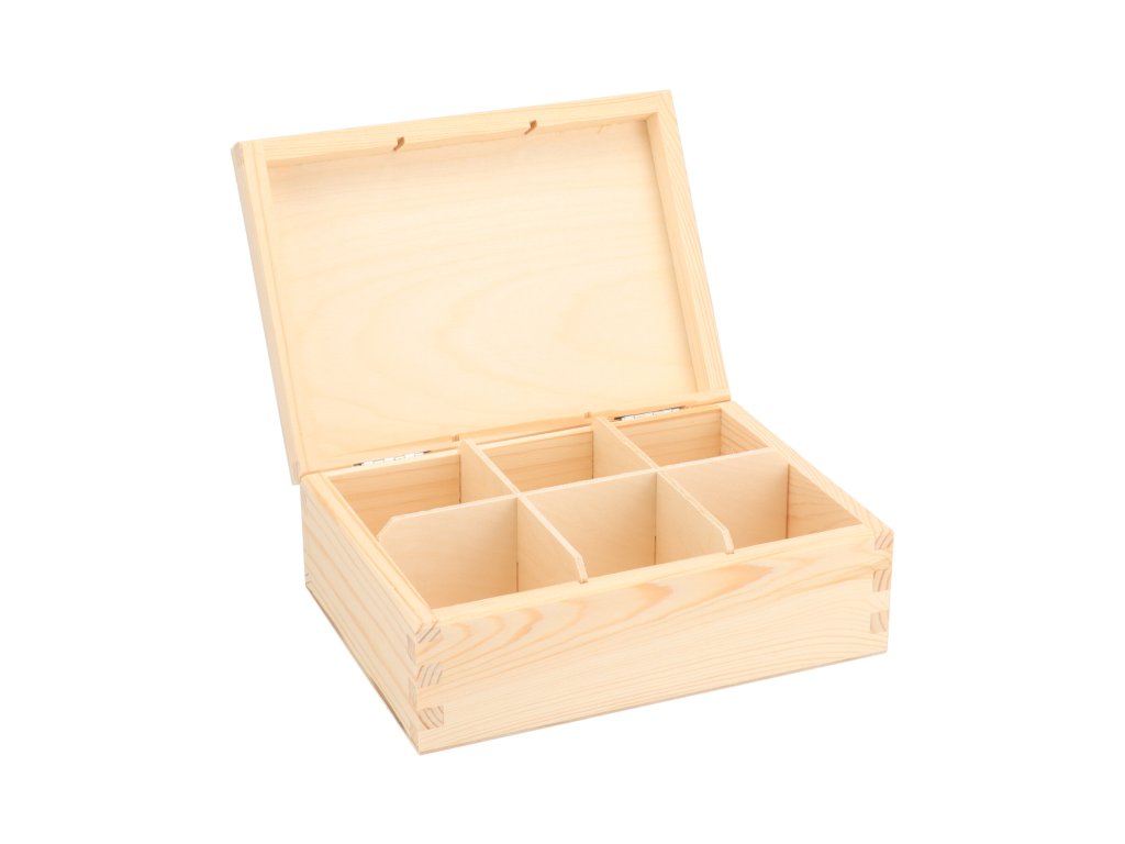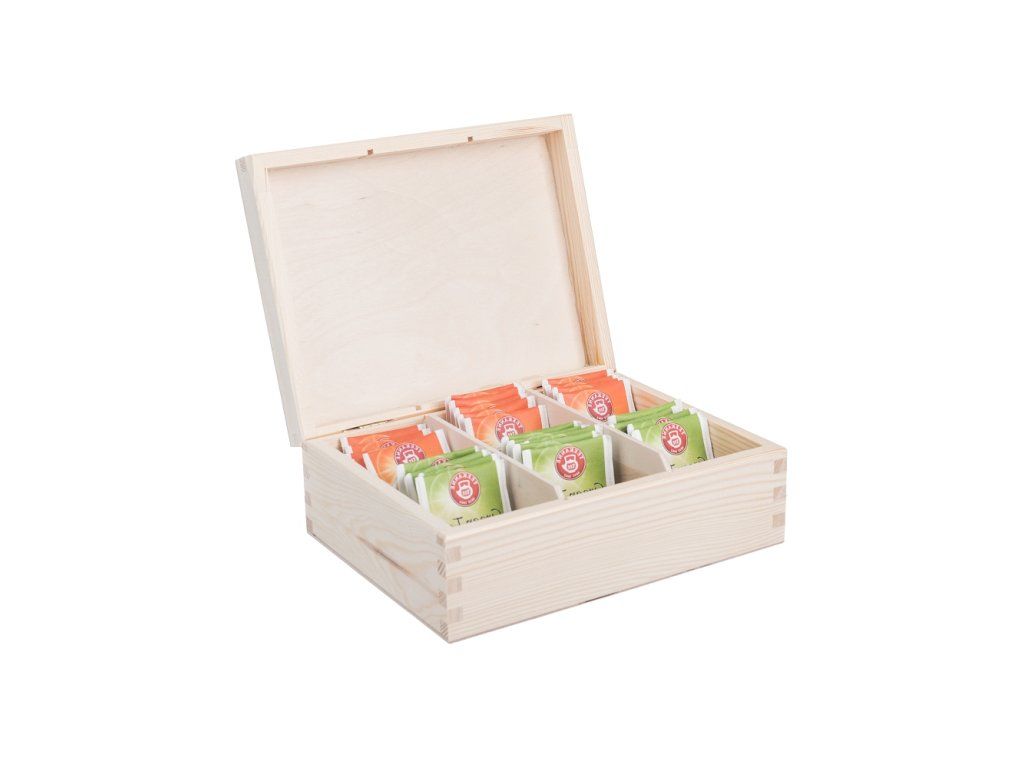 Die Box ist aus Kiefernholz gefertigt und bietet mit ihren 6 Fächern ausreichend Platz für alle Ihre Lieblingsteebeutel.