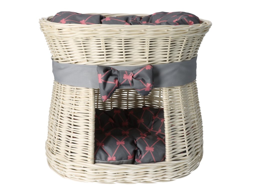 Weißes Katzenhaus aus Weidenruten, gepolstert mit grauen Kissen mit rosa Würfelmuster. Schenken Sie Ihrem Haustier einen Hauch von Natur, es wird sich auf den ersten Blick in dieses Tierbett verlieben. Eine Hütte, in der Katzen ihre Privatsphäre und Ruhe haben, wird zu einem perfekten Zufluchtsort.