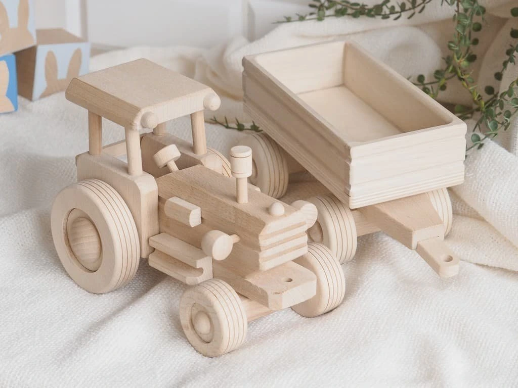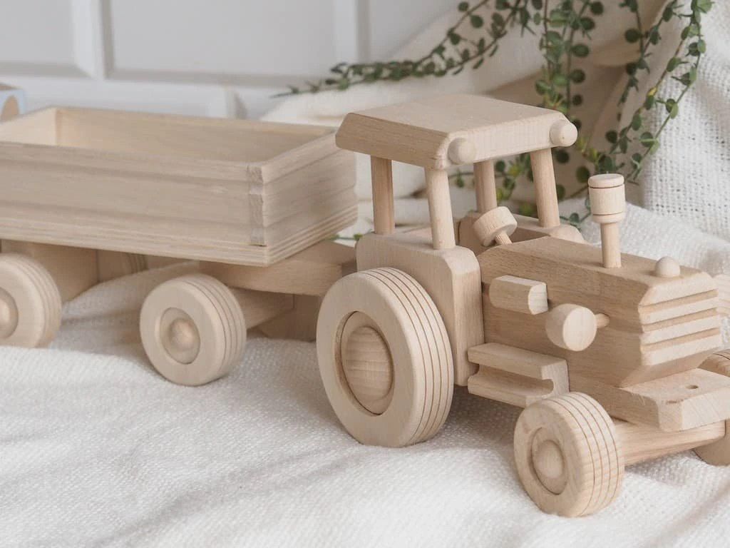 Das bewegliche Modell eines Traktors mit Anhänger aus natürlichem Buchenholz ist ein tolles Geschenk für Jungs. Das hochwertige Design garantiert eine lange Lebensdauer und ein schönes Aussehen des Holzspielzeugs.