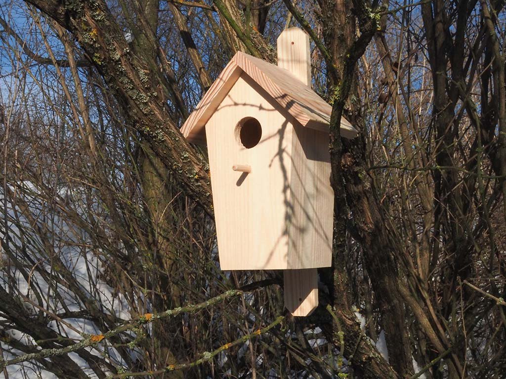 Das Häuschen hat ausreichend dicke Wände, um die Vögel vor Kälte zu schützen, und der Durchmesser der Öffnung beträgt 3 cm. Man kann es an einen Baum oder außen an die Fensterlaibung hängen, und der Boden des Häuschens lässt sich öffnen.