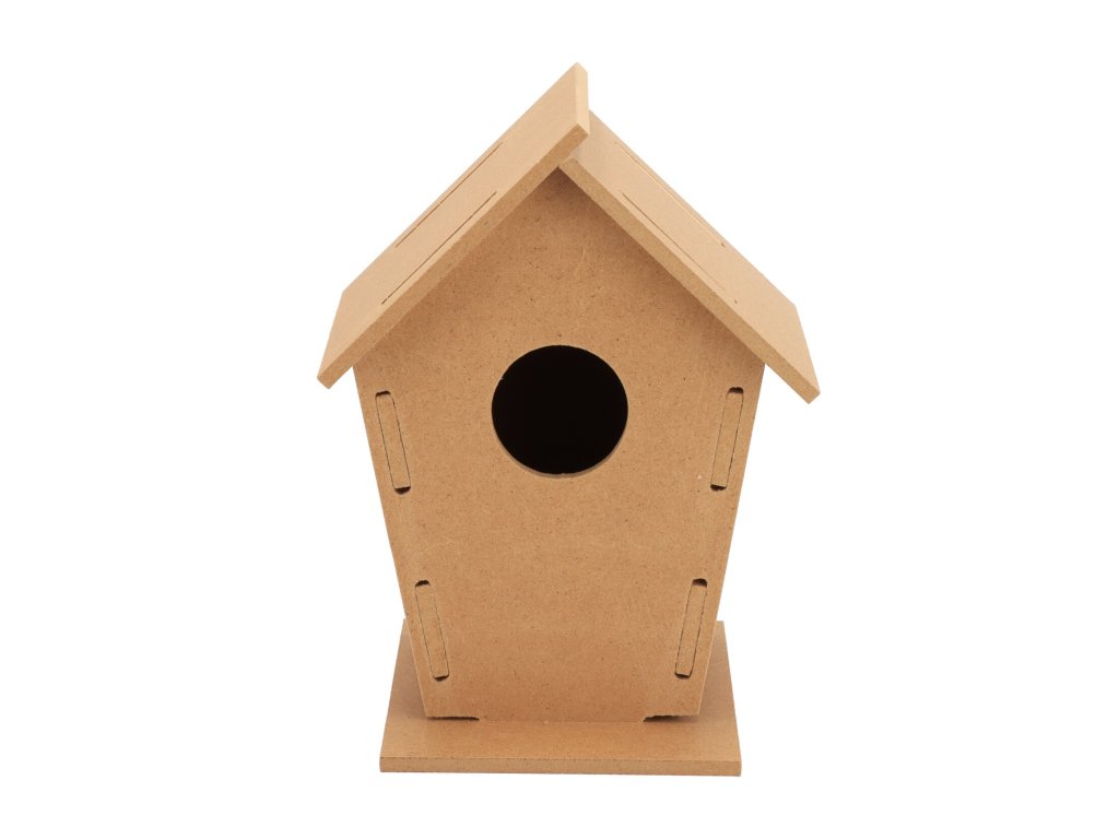 Bauen Sie Ihr Vogelhaus aus MDF. Ein Spaß für die ganze Familie, der letztlich auch ein Paradies für Vögel darstellt. Wenn Sie das Vogelhaus aufhängen möchten, empfehlen wir, den Boden zu sichern, zum Beispiel mit ungiftigem Klebstoff.