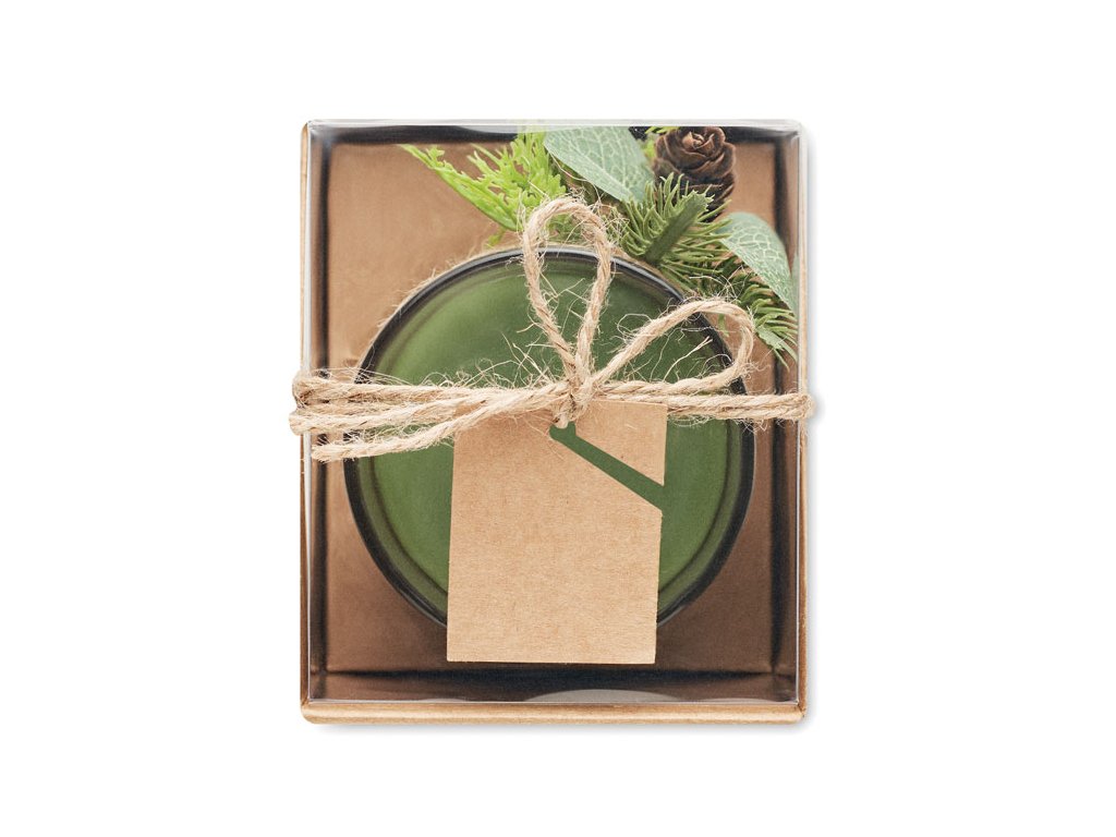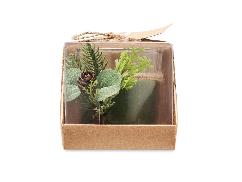 Der gläserne Kerzenhalter, der mit Tannenzapfen, Zweigen, Beeren und Sternen verziert ist, funkelt wunderschön im Kerzenlicht und schafft die richtige Atmosphäre.
